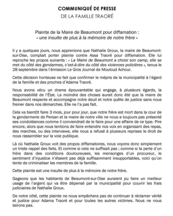 Suite à ces propos, Mme Nathalie Groux, maire UDI de Beaumont-sur-Oise, a mis à l'ordre du jour du conseil municipal de ce jeudi une proposition de délibération visant à assigner en justice Assa Traoré pour diffamation, selon les informations du