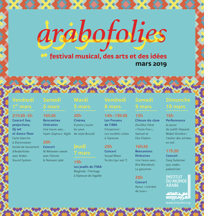 Arabofolies est le nouveau festival musical, des arts et des idées, organisé par l'Institut du Monde Arabe. Trois fois par an, cet événement propose des concerts, des séances de cinéma et des rencontres autour de thématiques précises. La première édition se déroulera du 1er au 10 mars 2019 autour de la Journée internationale des Femmes et du thème Résistances.