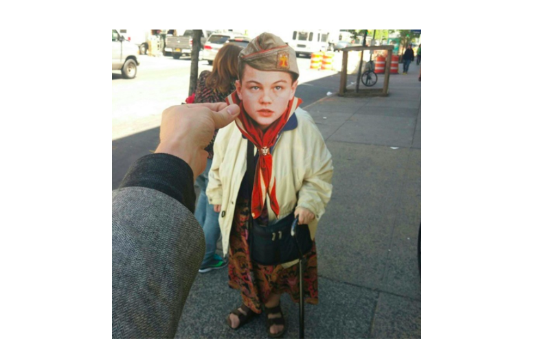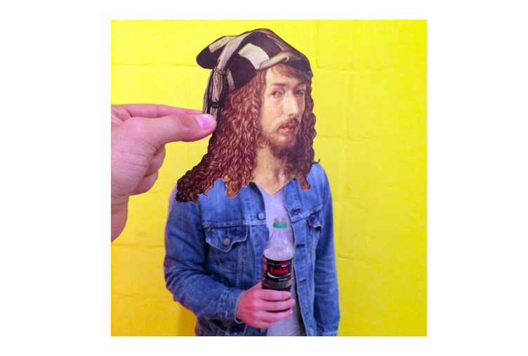 "composition surréelle", où l'éloignement est un double enjeu. Il y a d'abord la distance physique : pour obtenir les bonnes dimensions, l'espace entre le sujet et le fond doit être maîtrisé. Et puis, il y a celle qui se joue entre les époques : en goguette en 2015, Albrecht Dürer, Coca-Cola à la main, semble chercher désespérément le