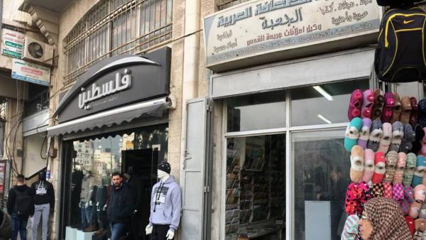 Entre deux magasins de prêt-à porter, la librairie d'Al-Jubeh dans le quartier de la place d'Al-Manara à Ramallah en Cisjordanie.