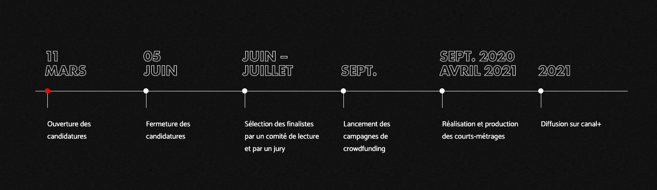 Le porteur de projet doit proposer un scénario de court métrage de cinq à dix minutes avant la fermeture des candidatures le 5 juin. Courant juin/juillet, un jury choisira dix projets qui seront par la suite développés et soutenus financièrement par Canal+. Parallèlement, un accompagnement dans la recherche de donateurs et dans la création d'un dossier de financement participatif sera assuré par "