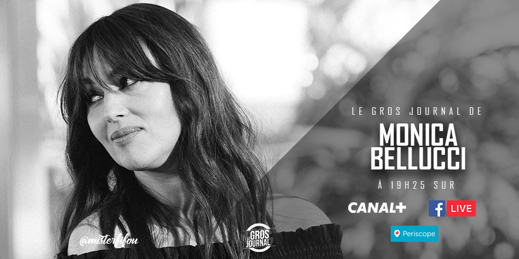 Exceptionnellement ce soir, en plus de la diffusion télévisée, l'émission sera retranscrite en direct sur la page Facebook et le compte Periscope du Gros Journal à 19h25.Aujourd'hui, c'est l'actrice italienne Monica Bellucci qui investit le plateau du Gros Journal. Dans moins d'un mois, elle ouvrira le Festival de Cannes dont elle est la maîtresse de cérémonie cette année. Mais ce n'est pas tout : 2017 est une année très riche pour l'actrice, qui sera à l'affiche du nouveau film d’Emir Kusturica ainsi que dans la saison 3 de la série Twin Peaks sous la direction de David Lynch. [caption id="attachment_61120" align="alignnone" width="750"]