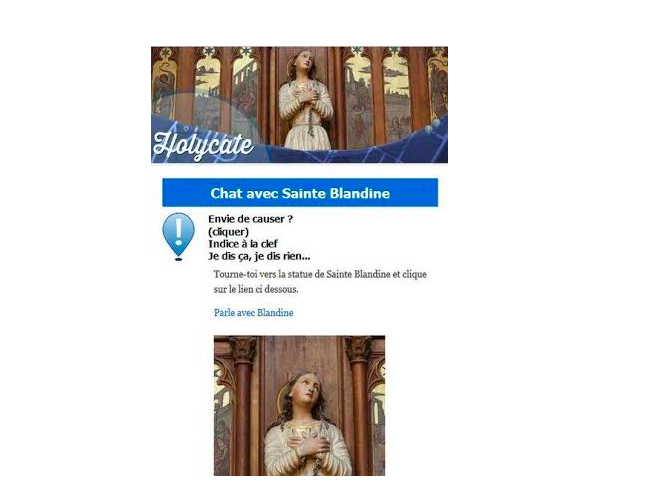 L'un des projets invite même ses utilisateurs à entrer en "conversation directe" avec Sainte Blandine, patronne des lieux.C'est l'une des options de "Holycate", un jeu de piste sur QR-Code (un code barre qui permet de stocker des informations numériques) qui propose aux visiteurs de l'église de la voir autrement, de façon "plus ludique" :