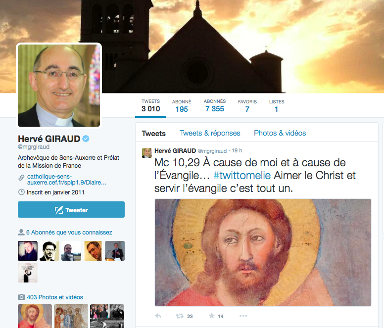 Il a suffi d'un tour sur le site de l'évêché pour contacter Monseigneur Hervé Giraud, alias Tweetévêque.Qu'on l'appelle ainsi, ça ne le dérange pas le moins du monde. "E-êveque"; "Monseigneur Twitter"... : au téléphone, l'archevêque de Sens-Auxerre égraine ses surnoms, et s'amuse de son titre de de premier évêque français inscrit sur Twitter. Le 25 mai, il y a donné son avis sur HackMyChurch :