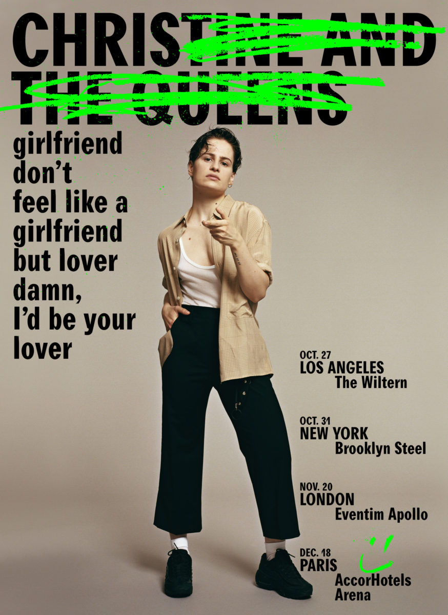 Chris(tine And The Queens) semble en tout cas avoir pris un virage dans sa carrière, si l'on en croit l'affiche de la mini tournée internationale qu'elle vient de dévoiler. Pour son retour, l'artiste fait une annonce multiple ; elle se produira en France, aux Etats-Unis et au Royaume Uni, et semble décidée à renouveler son image. La fin de son nom est rayée d'un trait vert pour ne laisser lire que "Chris", tandis que la chanteuse arbore un look plus décontracté qu'à son habitude.