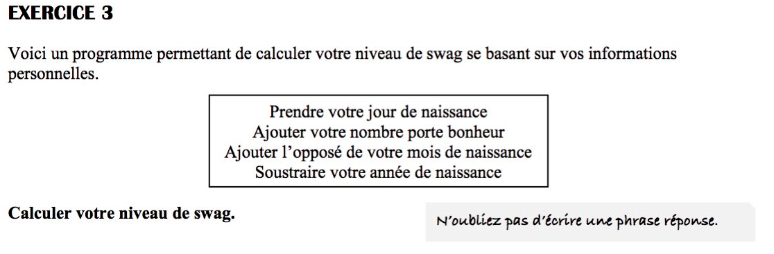 Un autre exercice du contrôle de mathématiques des 4èmes du collège Gabriel-Peri d'Aubervilliers (Seine-Saint-Denis).