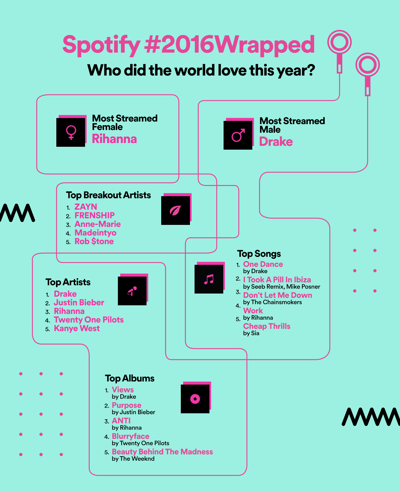 Dans l'histoire de Spotify, Drake est même l'artiste le plus de streamé avec 8,7 milliards d'écoutes au total.Il est suivi de Justin Bieber, Rihanna, Twenty One Pilots et Kanye West dans la catégorie "Top artistes". [caption id="attachment_50858" align="alignnone" width="1392"]