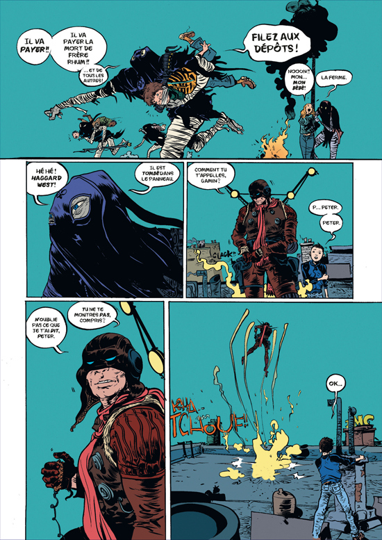 battling01 Le but c’est de devenir un vrai héros dès 12 ans, mais il est quand même aidé en cela d’une cape rouge (oui, comme l’autre, là) et de plusieurs t-shirts arborant un animal différent, lui servant de totem. Tout ceci paraît d’une banalité absolue, entre les gros monstres sortant de sous terre pour choper des enfants, le grand méchant Sadisto et la cape et les pouvoirs, mais c’est sans compter sur le talent (lui aussi absolu) de Paul Pope (l'auteur, donc), qui a déjà brillamment revisité le personnage de Batman, et qui baigne autant du côté de la BD indé pure (100%, chez Vertigo/Dargaud, par exemple) tout en officiant parallèlement en tant que designer chez des grandes marques comme Diesel ou DKNY. Pope reprend les codes habituels du comics de superhéros tout en y apportant des touches très personnelles, loin des formatages habituels auxquels nous sommes habitués. Parce qu’il faut bien dire qu’on en bouffe, du superhéros, depuis quelque temps, et qu’on (enfin moi, surtout, vous je ne sais pas) a un peu tendance à se lasser de mecs qui se tapent dessus en collants. Déjà, graphiquement, ça en jette. Ensuite, côté contenu, il y a à la fois de la baston jouissive de partout avec des immeubles qui s’effondrent et une réflexion sur la préadolescence, ainsi que l’utilisation politique d’une telle présence dans la ville. Le tome I foisonne de tous les côtés et ne déçoit pas par sa densité. De nombreuses questions restent en suspens, notamment concernant cette jeune fille, Aurora, fille de Haggard, superheros tué au début de cette chronique et du livre... Elle est un peu l’opposée de Battling Boy : lui, il a pas envie. Mais vraiment pas. Il préfèrerait largement être ailleurs à faire autre chose, mais bon, la vie est ainsi faite qu’on n’a pas toujours le choix, surtout qu’il a bien plus peur de ses parents que des monstres.