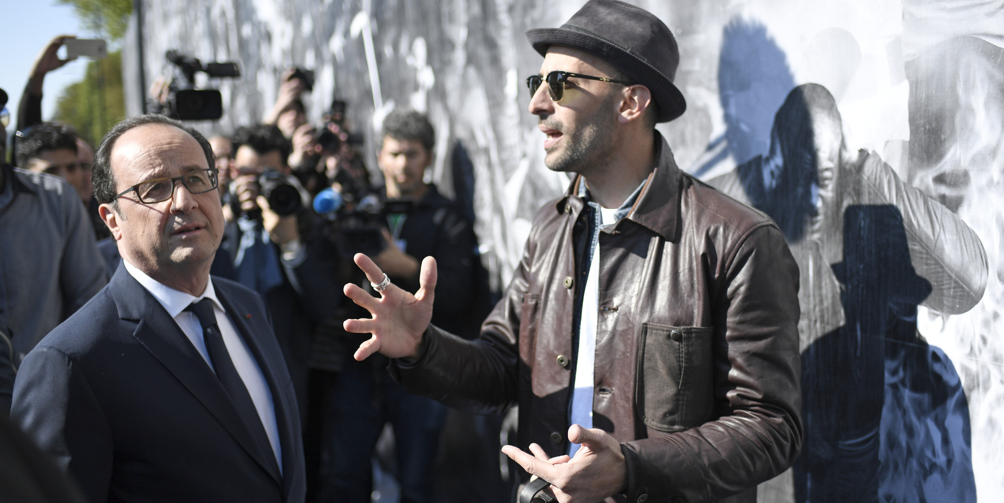 Le 19 avril dernier, le photographe JR et le réalisateur Ladj Ly inauguraient la dernière étape d'un travail de près d'une quinzaine d'années : la fresque Chroniques de Clichy-Montfermeil. Pour cet événement, ils ont convié le Président de la République.