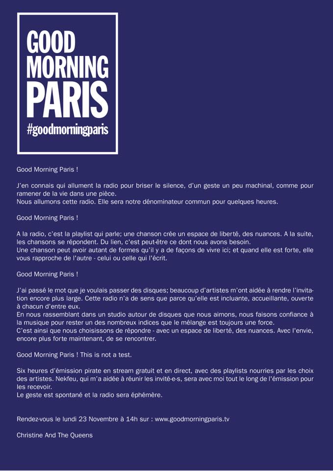 Goodmorningparis.tv : c'est à cette adresse que vous pourrez écouter, dès 14h ce lundi 23 novembre, la radio éphémère lancée à l'initiative de Christine & The Queens à laquelle tous participeront. La chanteuse, épaulée par Nekfeu, les a réunis pour 6 heures d'antenne, qui seront disponibles en replay."J’en connais qui allument la radio pour briser le silence, d’un geste un peu machinal, comme pour ramener de la vie dans une pièce. Nous allumons cette radio. Elle sera notre dénominateur commun pour quelques heures" affirme Christine and The Queens sur le site de la radio, après en avoir fait l'annonce sur Twitter, quelques jours plus tôt. Celle-ci proposera, gratuitement et en direct, des playlists élaborées par les artistes en question. "En nous rassemblant dans un studio autour de disques que nous aimons, nous faisons confiance à la musique pour rester un des nombreux indices que le mélange est toujours une force. C’est ainsi que nous choisissons de répondre - avec un espace de liberté, des nuances. Avec l'envie, encore plus forte maintenant, de se rencontrer".