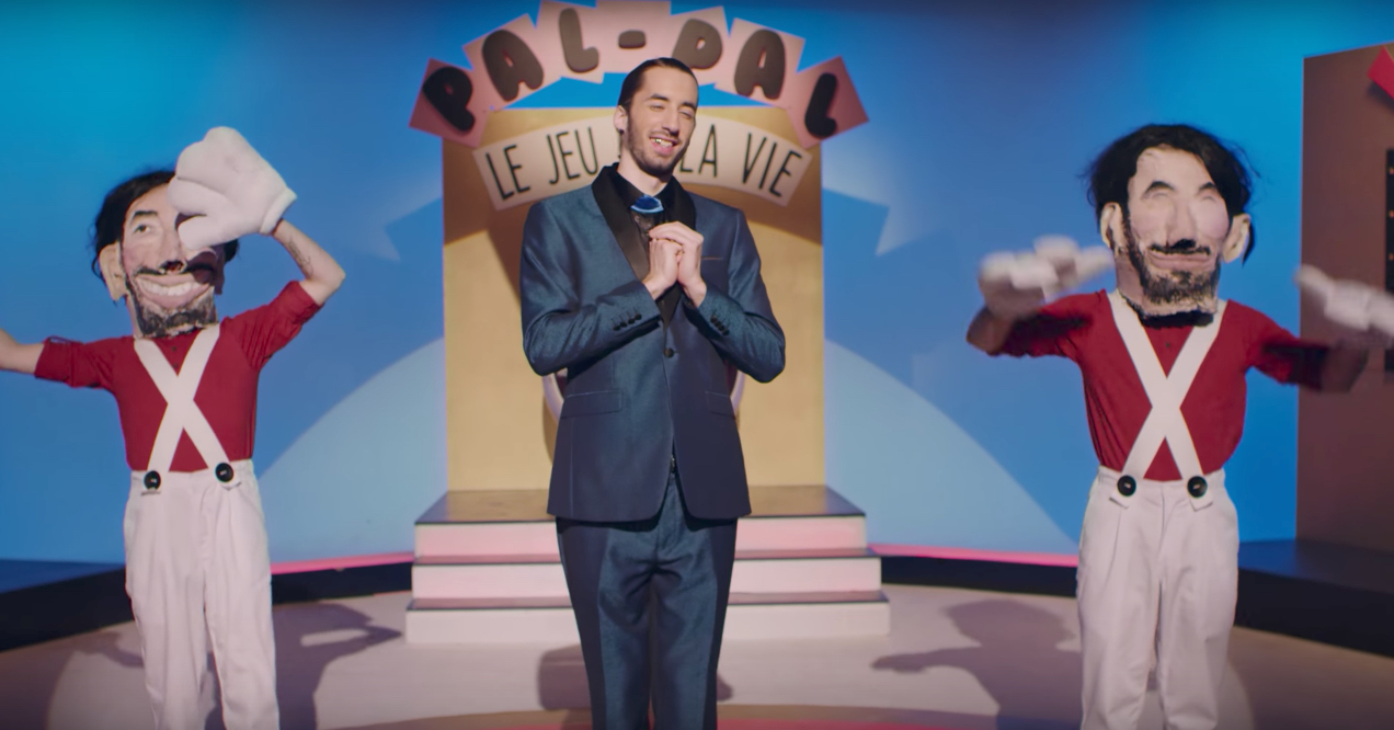 Après avoir parlé de la complexité de l'amour dans son dernier clip "Yeux Disent", Lomepal s'attaque au caractère ridicule et dangereux des jeux télévisés dans "Pal Pal". "Et maintenant on accueille nos merveilleux candidats, Laurent et Marie, on les applaudit bien fort" scande le rappeur, déguisé en présentateur télé - trop - souriant.