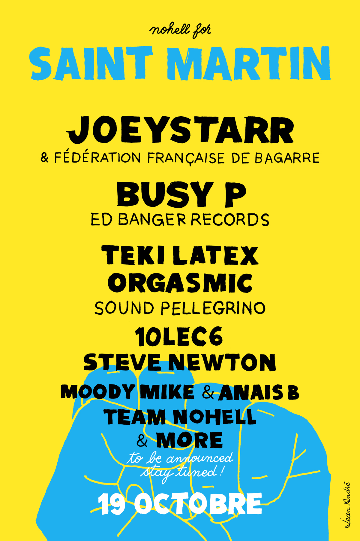 JoeyStarr, Busy P, Teki Latex, DJ Orgasmic, 10LEC6, Moody Mike, Anaïs B et Steve Newton (un artiste de Saint-Martin), se produiront sur scène et reverseront l'intégralité de leur cachet au profit de l'aide aux victimes du cyclone.[caption id="attachment_68507" align="alignnone" width="1200"]