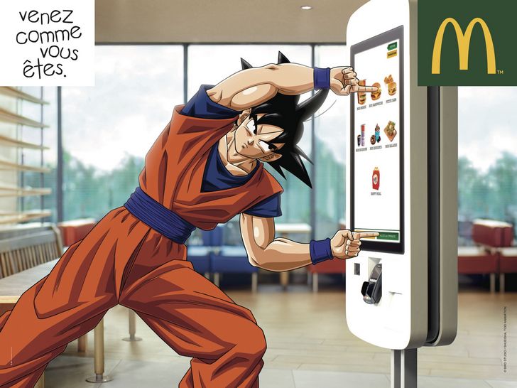 Mc Donald's utilise en ce moment Goku (aux côtés de Lucky Luke et d'un dinosaure de Jurassic World) dans sa dernière campagne d'affichage. On y voit notre héros préféré tenter de fusionner avec une borne de commande. Pas vraiment de justification, mais ça fait quand même très plaisir.