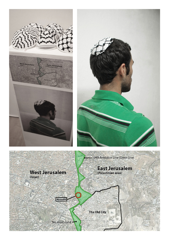 Je suis allé à Jérusalem-Est pour acheter des keffiehs, avec lesquels j’ai fabriqué des kippas. Puis je me suis mis sur la route des prophètes, dans le quartier de Morasha, qui sépare Jérusalem-Est et Jérusalem-Ouest. Et j’ai proposé ces kippas-keffiehs à la vente sur cet entre-deux.[caption id="attachment_65440" align="aligncenter" width="564"]