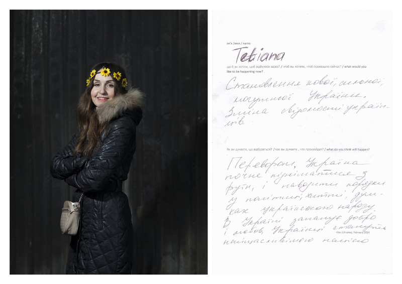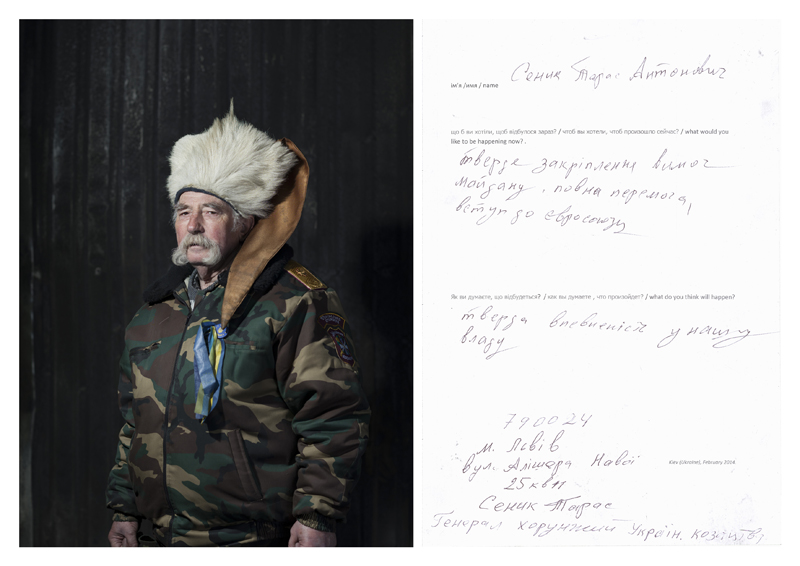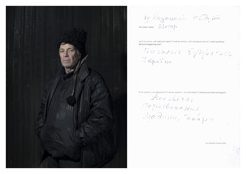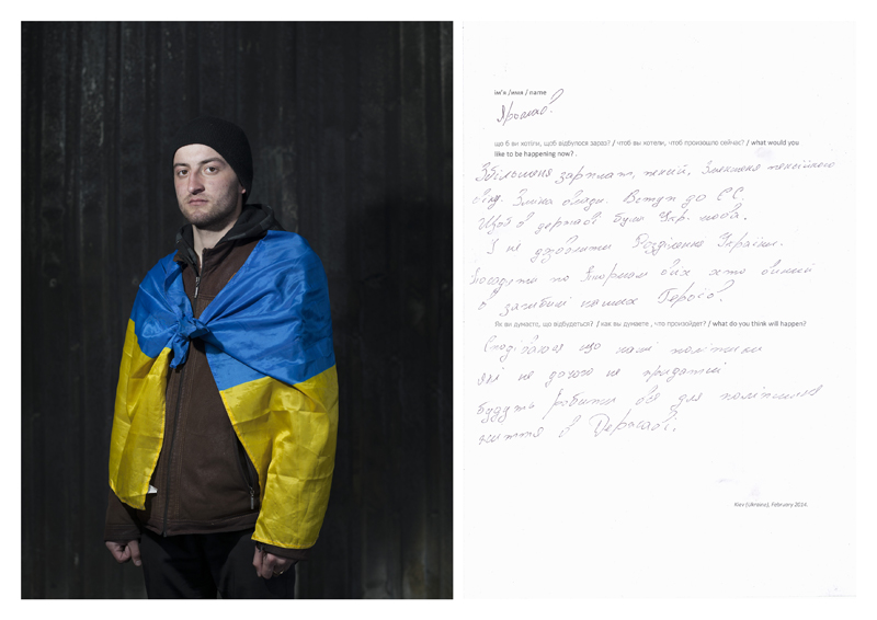 As-tu réussi à en vendre ? Personne n’en a acheté. Je me suis fait un peu pourrir au début, des deux côtés d’ailleurs. Je leur ai expliqué mon projet, et du coup ils m’ont laissé tranquille. Quelle était l'objectif de ta démarche ? L’idée était de proposer une sorte d’hybridation entre ces deux cultures, entre les Palestiniens et les Israéliens. Malheureusement, beaucoup de choses les opposent aujourd’hui, dans un conflit dont on ne voit pas la fin... On peut très bien imaginer qu'un jour, Israéliens et Palestiniens vivront ensemble sur un même pied d'égalité dans la paix et le bonheur, même si actuellement tout nous porte à croire que ce n'est pas pour tout de suite. C’est une certaine utopie, mais c’est bien d'y croire... Parfois elles finissent par arriver. Peut-on encore acheter ces kippas quelque part ? Oui bien sûr, je les vends toujours, elles sont à 60 euros. Tu es allé en Ukraine en 2014 lors de la révolution. Tu as pris cent portraits d’Ukrainiens que tu as accompagnés d'un questionnaire. Que leur demandais-tu ? J’ai fait pas mal de recherches dans différents médias, et je me suis aperçu qu'entre les pro-russes et les pro-occidentaux, les analyses étaient totalement divergentes. J’ai voulu comprendre ce qu'il se passait alors j'y suis allé. Il se trouve que je suis arrivé au moment où Viktor Ianoukovytch (premier ministre ukrainien à trois reprises entre 2002 et 2007, puis président du pays en 2010 avant de se faire destituer en 2014, NDLR) a fui. Il n'y avait plus de président, pratiquement plus de gouvernement ni de police. Le pays était entièrement sous le contrôle de la population et j’ai voulu saisir ce moment de latence où tout paraissait possible. Avant de prendre les gens en photo, je leur ai demandé : "Qu’est-ce que vous aimeriez qu’il se passe maintenant ? Et qu’est-ce que vous pensez qu’il va se passer ?". [caption id="attachment_65585" align="alignnone" width="800"]