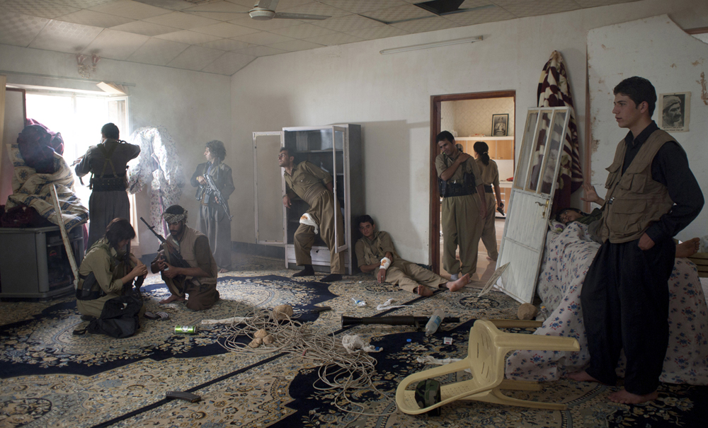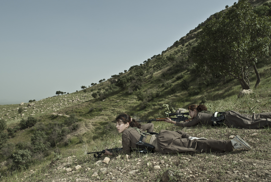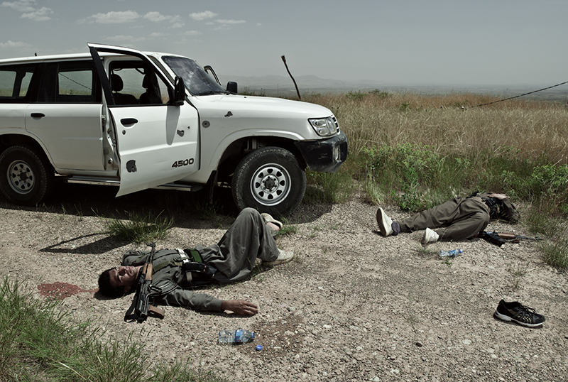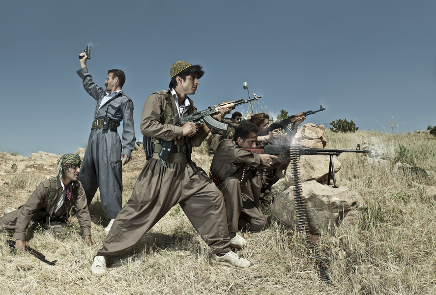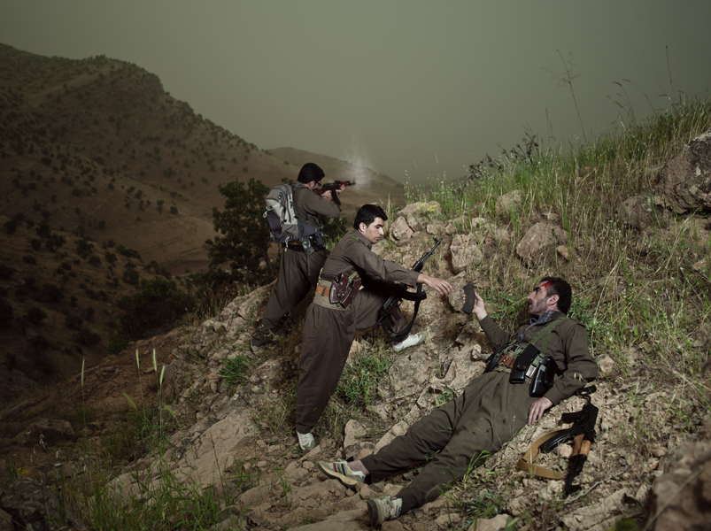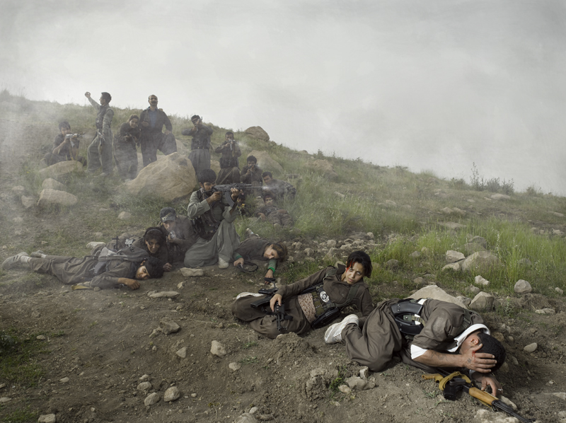 Pourquoi ne peut-on pas voir la vidéo en intégralité sur ton site ? Je ne l’ai pas mise en entier car c’est dangereux pour les combattants, même si les visages sont floutés. Et je n’ai pas envie que cela soit récupéré par des personnes mal intentionnées. La série de photos « Théâtre de guerre » est assez déstabilisante. On a l'impression que ce sont des photos prises sur le vif, et pourtant on voit qu'il y a de la lumière artificielle. Est-ce que c'est de la mise en scène ? Comment as-tu fait ? C’est un projet fait en Irak avec un groupe de guérilla kurde. Ce sont de vrais combattants sur une vraie zone de conflit, qui rejouent leur réalité dans des mises en scène inspirées de peintures classiques. L’idée, c’est que lorsque l’on regarde l’image, on se demande quelle est la part de réel et la part de faux. [caption id="attachment_67098" align="aligncenter" width="640"]