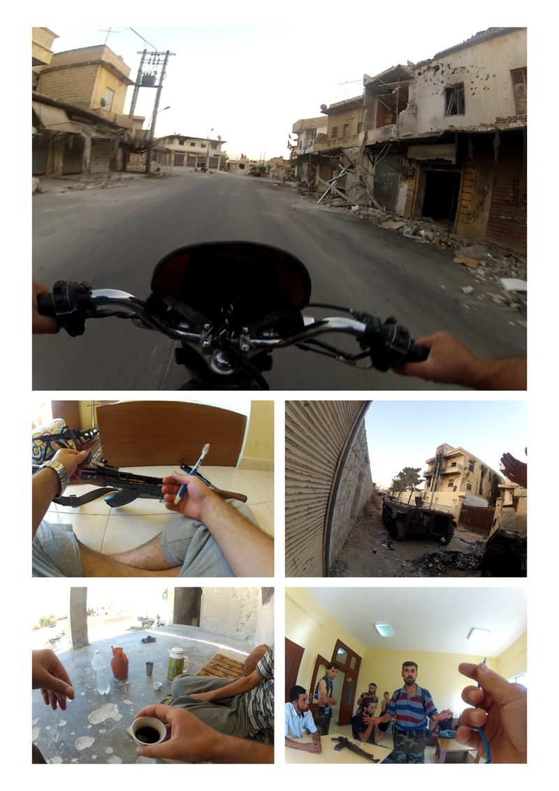 Tu as diffusé une vidéo en direct d'un soldat qui porte une caméra pendant 24heures. C'est ce phénomène que tu as voulu montrer ? Oui, c’est mon projet « Chebab », 24 heures de la vie d’un combattant rebelle en Syrie. Dans cette vidéo, tu vis la vie du combattant et... tu t’ennuies avec lui. En zone de guerre, la chose la plus présente est l’attente. Tu attends avec une tension permanente, tu ne sais jamais si tu seras toujours vivant à la fin de la journée. Comment as-tu choisi le combattant qui porterait cette caméra ? À la base, je ne devais pas travailler avec lui, mais plutôt avec un combattant avec qui je m’entendais très bien, qui parlait anglais et était très calme. Finalement il n’a pas pu la faire - il a dû partir précipitamment, car un de ses amis a été gravement blessé. Un autre combattant est venu me voir et m’a dit : « je vais la faire la vidéo, ne t’inquiète pas ». C’était un profil complètement différent, très sympa, mais hyper instinctif. À un moment, il veut passer voir sa femme mais il a la camera ; ça l’embête parce qu’il ne veut pas l’enlever, comme je lui avais dit de la garder... Donc il me cherche pour me demander comment l’enlever sauf qu’il ne me trouve pas, on l’entend dire : « putain il fait chier, il est où Abu Saïd ? » C’était le nom de guerre que m’avaient donné mes amis. [caption id="attachment_66521" align="alignnone" width="800"]