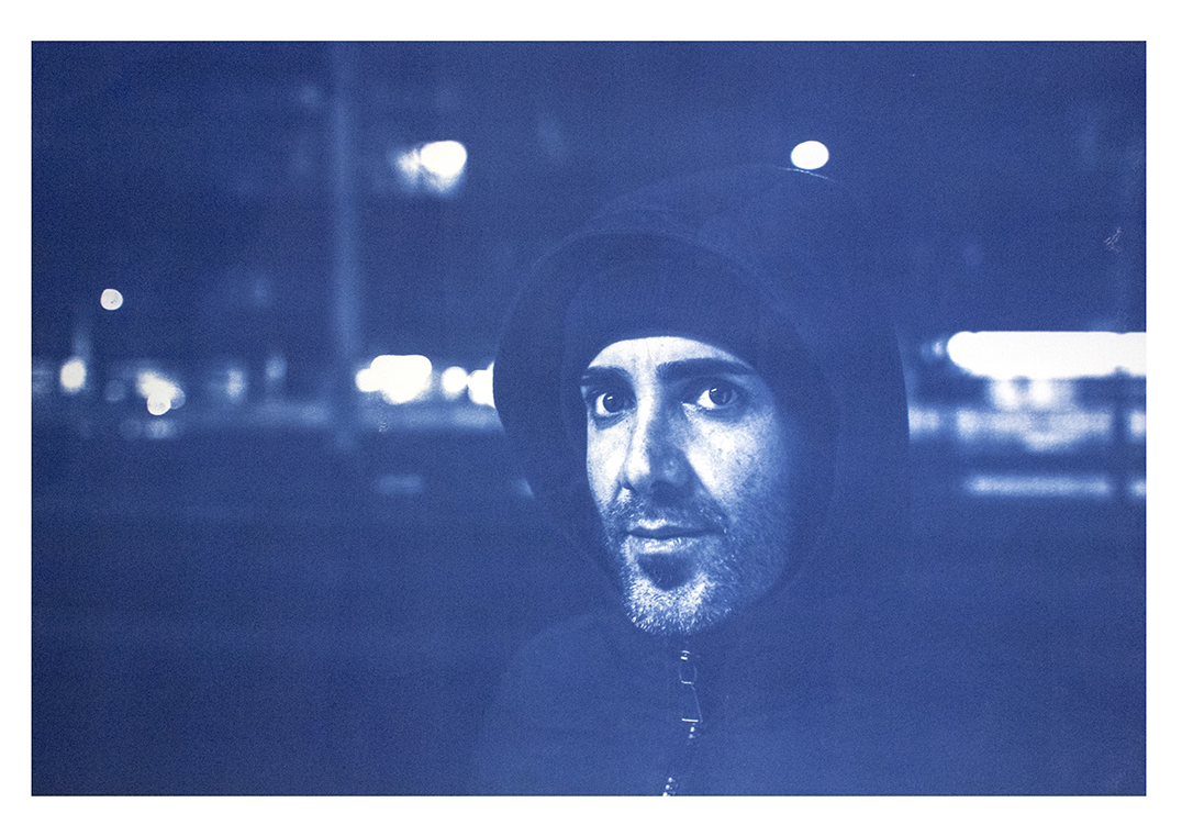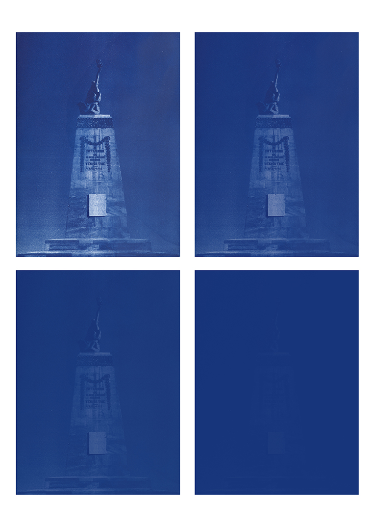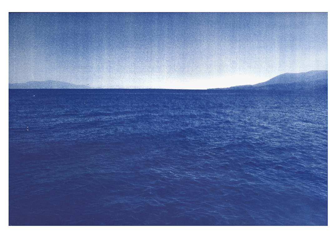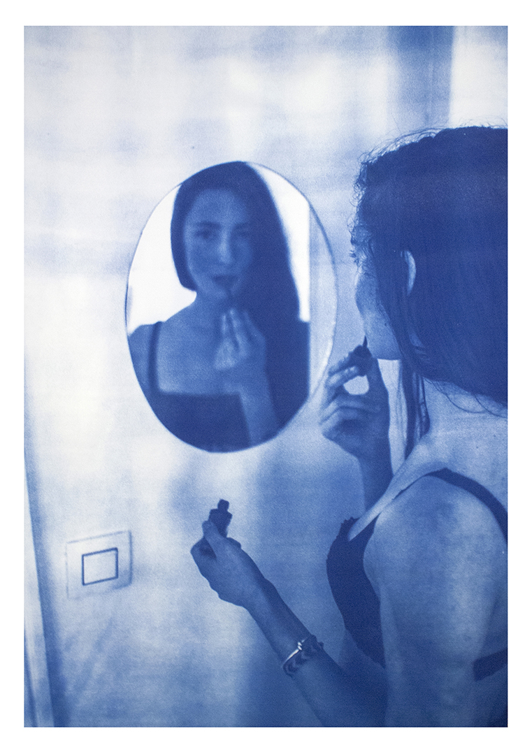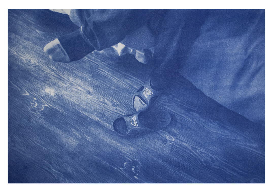 Toutes les photos sont bleues, réalisées avec la technique du cyanotype que j’ai modifiée pour laisser les images sensibles à la lumière (le cyanotype est un ancien procédé photographique monochrome pour la photo argentique, qui permet d'obtenir des tirages bleus, NDLR). Ainsi, les images disparaissent progressivement au fil des jours de l’exposition, laissant place à des monochromes bleus.