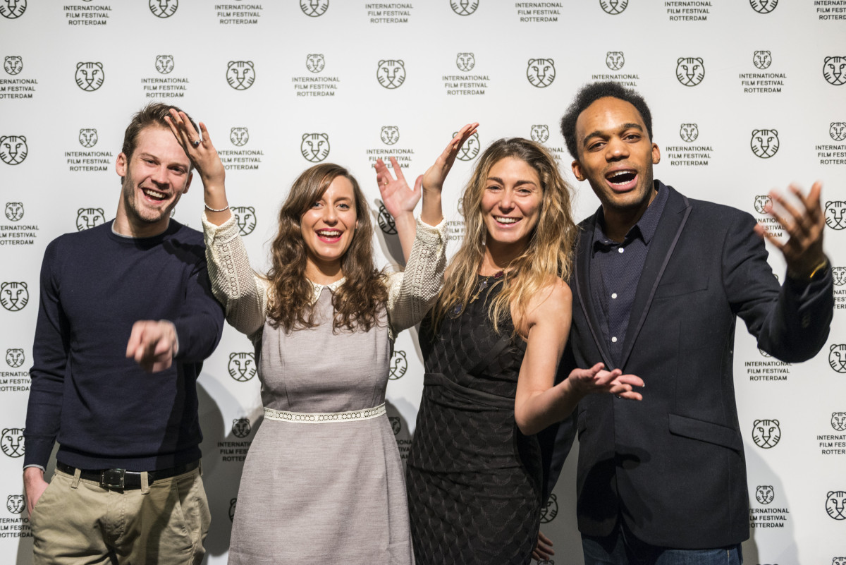 De gauche à droite : Matthieu Longatte, Anaïs Volpé, Émilia Derou-Bernal et Alexandre Desane au festival de Rotterdam, où le film était sélectionné en février dernier. Heis (Chroniques) a remporté le prix du meilleur film étranger au dernier Los Angeles Film Festival.