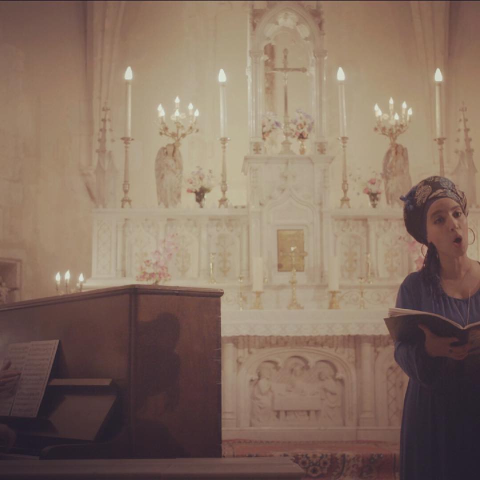 Narimène Bey chantant dans une église.