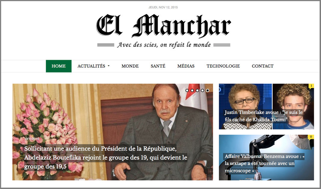 Pour être franc, je me suis, en effet, lancé dans la parodie en voyant ce que faisaient nos confrères du Gorafi.Combien de visites le site engrange-t-il par mois ? Ça vacille entre 700 000 et 800 000 visites par mois. Vous aimez bien plaisanter sur le président Bouteflika… quelles sont vos cibles favorites ? Le président Bouteflika est en effet notre cible principale. Le Premier ministre Sellal, le secrétaire général du FLN Amar Saâdani, et le président du forum des chefs d’entreprise Ali Haddad en prennent plein la figure aussi. Sinon, la famille Le Pen et Daech sont des cibles potentielles à chaque fois que l’actualité s’y prête.