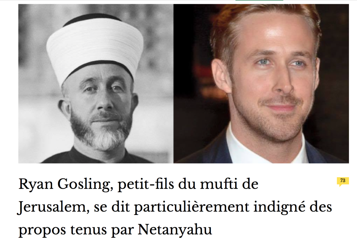 Il n’y a pas très longtemps la Ligue de Défense Juive (LDJ) et un journal marocain ont relayé un article disant que Ryan Gosling était le petit-fils du grand mufti de Jérusalem.