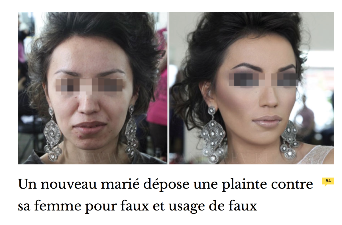 Celui du mari qui dépose plainte contre sa femme pour 'faux et usage de faux' le lendemain de leur nuit de noces après l'avoir vue sans maquillage... L'article a été partagé un peu partout à travers le monde. Je pense que ça reste à ce jour le canular qui a eu le plus de succès.