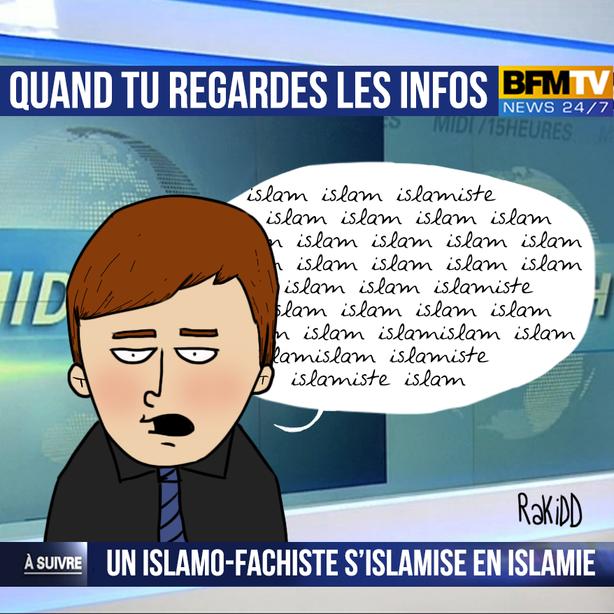 Quand je regarde mes dessins, je me rends compte que je perds en qualité dans les périodes chargées en actualité. À force de vouloir réagir, on en arrive à faire des dessins trop rapidement. Dessin de Rakidd Est-ce que tu suis d’autres blogs BD ? Pour moi, le meilleur toutes plate-formes confondues est celui de Sanaa-K. Il m’a donné envie d’ouvrir le mien. J’adore vraiment son style, c'est vraiment impressionnant. Quand je suis trop fier de ce que j’ai dessiné, je vais faire un tour dessus, ça me calme ! Le format du blog BD n’est pas un peu mort ? D’un côté tant mieux pour moi s’il y a moins de blogs. Peut-être que je peux apporter un truc qu'il manque. Puis en même temps, quand ça a un peu explosé, on a beaucoup dit qu’il y avait trop de Youtubeurs et que ça allait mourir. Et aujourd’hui, il y a des nouvelles têtes qui apparaissent, un autre style. Je ne pense pas que ce soit une question de format.