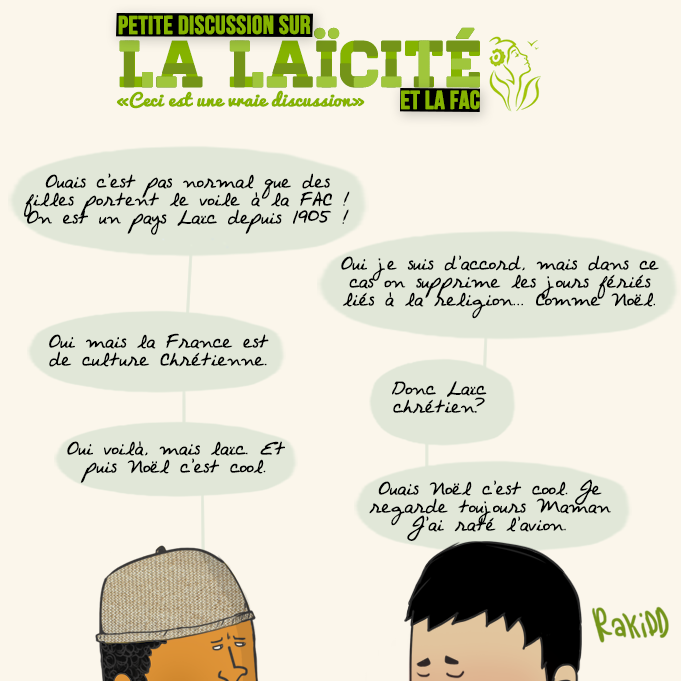 Il y a eu toute cette affaire avec le festival d'Angoulême. Penses-tu qu’il y a un problème de représentation aujourd’hui dans la bande dessinée en France, que ce soit les femmes ou d’autres minorités ? Pour les femmes, c’est effectivement plus dur de percer dans la BD traditionnelle. C’est un monde d’hommes. Sur Internet, elles n’ont rien à demander à personne, c’est un territoire parfait pour elles. Après, il ne faut pas se voiler la face, beaucoup de gros blogs sont tenus par des hommes. Pour les minorités, je ne sais pas trop. Je n’en vois pas beaucoup, même dans la BD “belge”. Je ne sais pas si c’est culturel, il faudrait voir dans les autres pays. Mais je n’aime pas mettre des étiquettes. C’est bien de pouvoir donner l’exemple, j’ai quelques fans qui m’écrivent à ce sujet, mais je ne veux pas être le dessinateur des arabes. Dessin de Rakidd sur la laïcité Tu as un style qui peut facilement plaire aux enfants, tu travailles pour Gulli d'ailleurs. Est-ce un aspect que tu recherches ? Oui. À la base je voulais être illustrateur pour enfants. J’aimerais bien en faire plus, être publié dans le Journal de Mickey, etc. Histoire de varier. Avec le dessin pour enfants, on doit prendre son temps, réfléchir à la manière dont écrit, c’est souvent plus compliqué. Ce que je vais dire est bête mais c’est vrai : ce n'est pas parce que tu penses une chose que c’est vrai. Tu es responsable de ce que tu vas leur montrer. Les enfants n’ont pas encore de jugement, ils ne savent pas. Quels sont tes inspirations ? J’ai été marqué par le travail d’Akira Toriyama (créateur de Dragon Ball, ndlr) et d’Osamu Tesuka (créateur d'AstroBoy, ndlr), que j’ai beaucoup lu quand j’étais gamin. À côté de ça, je suis un gros fan de rétro gaming – je serais super heureux de faire du chara design pour un jeu vidéo d’ailleurs. Dans ma tête tout se mélange : le pixel art, Toriyama, Murakami aussi, le Caravage, Hokusai… Au final, je ne sais pas comment on s’invente un style, mais j’ai l’impression d’avoir le mien. Inspirations de Rakidd J’ai vu que tu avais commencé à poster des petites vidéos pédagogiques, qu’est-ce qui t’a poussé à faire ça ? Je trouvais qu’il y avait trop de monde dans le secteur de l’humour, je ne me voyais pas aller dans cette niche. Je ne voulais pas faire de l’humour fast-food, des vines. Les Youtubeurs que j’aime bien font autre chose : UsulE-PenserAxolotl, etc… Je veux faire des vidéos ludiques. Je me documente pas mal. Pour ma vidéo sur les gâteaux Bamboula par exemple, je voulais faire un top des marques racistes, et en cherchant un peu sur le sujet, j’ai vu qu’il y avait tellement à dire là-dessus. Comment gères-tu tes réseaux sociaux ? Je me rends compte que les gens ont besoin de contenu. Il faut faire partie de leur quotidien, être présent tous les jours. Au début c’est facile, tu connais tous les gens qui commentent. Mais à 16 000 fans, ça devient plus compliqué de répondre aux gens. Mais j’essaie. Je prends une heure par jour pour répondre aux gens. J’aime bien aussi les laisser débattre entre eux, sans trop intervenir, ça donne de très bonnes conversations. Est-ce que tu penses porter une voix ? Non, pas du tout.