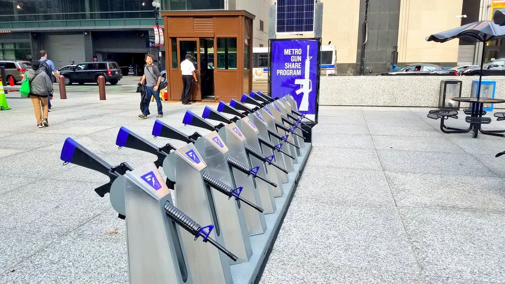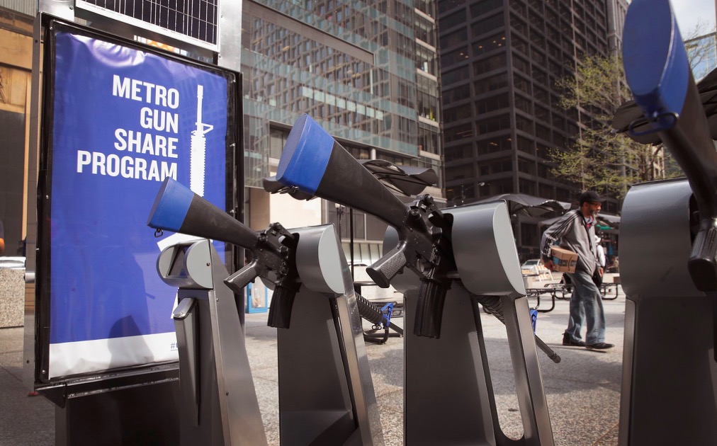 Imaginez... Vous êtes dans les rues de Chicago. Vous vous promenez. Vous flânez. Et à un coin de rue, vous tombez nez à nez devant une borne de distribution d'armes en libre-service. Quelle serait votre réaction ?Acheter une arme serait aussi facile que de louer un vélo aux États-Unis ? C'est ce que l'installation artistique "Chicago Gun Share Program" a voulu dénoncer à travers une fausse station-service d'armes. L'objectif ? Provoquer un choc. Ici, l'art est utilisé comme un moyen de sensibiliser les passants autour de ce phénomène aussi décrié que soutenu aux États-Unis.
