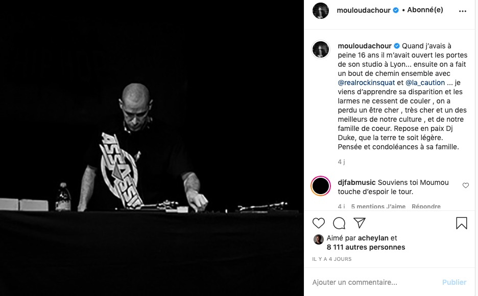 "Salut Duke, Avant de partir, t'as oublié de venir mixer dans mon émission tu sais... je dis ça, je dis rien. Comment te dire, grande perche, que ton travail de beatmaker restera à jamais gravé dans la roche ? Comme moi, tu avais le même goût prononcé pour tout ce qui n'était pas commercial. Quand on était là, tout les deux sur scène, ça sentait le Hip Hop à plein nez. Pour chacun, les platines étaient notre expression, notre langage : scratch beats and rhythm. Purée tu étais un bon. Un turntablist hors pair. Être passionné ça nous a fait tenir, ça nous a fait voyager, voir d'autres cultures. Sacré toi, mon Duke. Je me rappelle, après les concerts avec La Caution. On rigolait tous ensemble, à se vanner jusqu'à l'infini avant de s'endormir dans les bras de Morphée au petit matin. Comment veux-tu que ça ne me manque pas ? Tu as été rappelé, mais nous continuerons ton travail de passionné, sans te trahir, tel que tu étais. Ton pote et ami. DJ Fab."