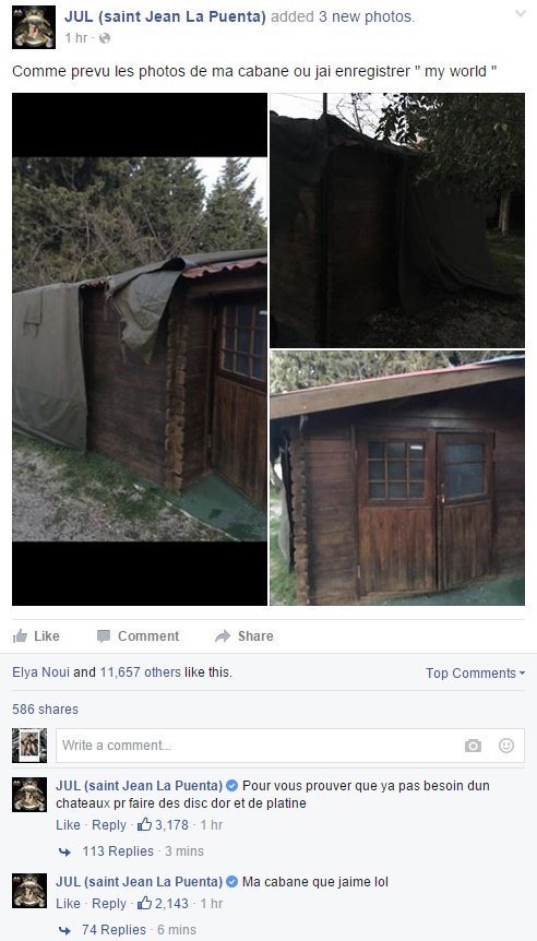 Cette photo de sa cabane et ces commentaires, c'est la marque d'une sincérité naïve que les néophytes trouveront peut-être décontenançante. Il faut se laisser conquérir. Jul aime partager des petits moments de sa vie sur les réseaux sociaux. Il revient sur ce qui a changé dans sa vie, n'oublie jamais de remercier ses fidèles.