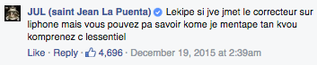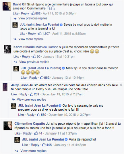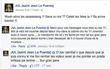 Jul ne fait aucun effort sur l'orthographe, ça le fait cordialement chier, et il veut juste se faire comprendre. Du coup quand on lui demande pourquoi il écrit aussi mal, il répond poliment. Tout simplement. C'est là son secret. Il répond à ses fans. C'est déjà une différence énorme avec le reste des rappeurs. Il a les mains libres sur son compte, il y fait ce qu'il veut, apparemment sans réel contrôle. Ses réponses sont sans filtre, et souvent super mignonnes.