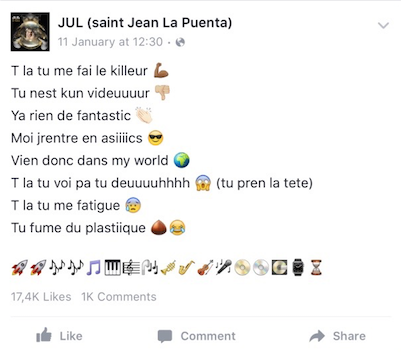 DJ Khaled en a fait un business à part entière sur Snapchat. Chez Jul, la barrière est brisée. On ne suit pas son Facebook comme celui d'un artiste. Plutôt comme celui d'un pote du lycée qui a percé dans le rap, mais qui continue à placer des joyeux Noël "