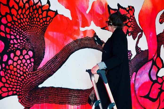 Carolina Falkholt, connue pour ses énormes fresques qui s'inspirent des organes génitaux féminins. Auparavant, l'une de ses oeuvres avait fait polémique en Suède.