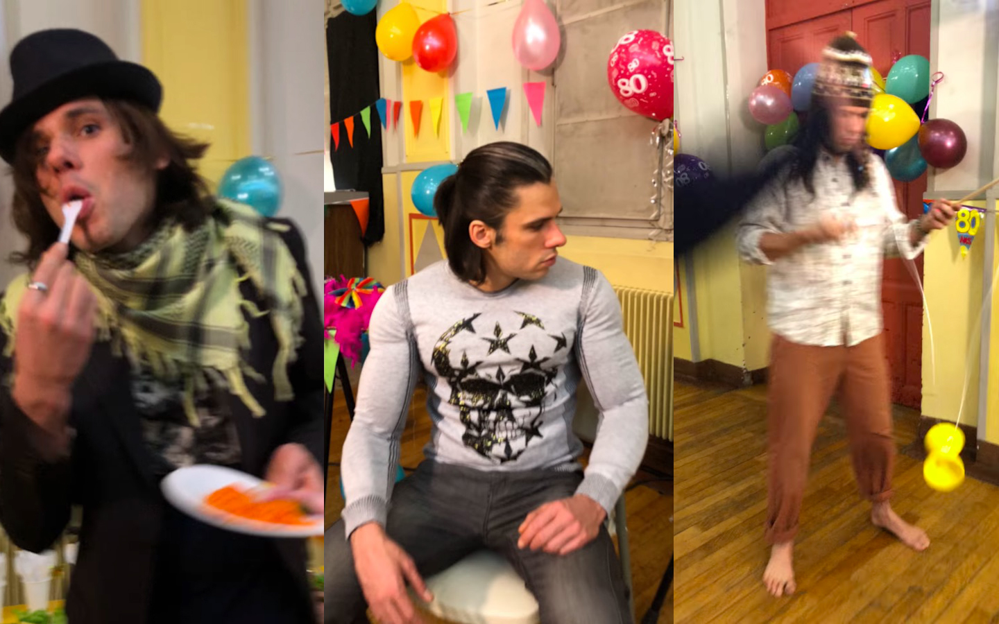 "y'a lui qui fait ça, y'a lui qui fait ça, mais si on s'est tous retrouvés dans cette salle des fêtes de campagne, c'est parce qu'on s'aime." Le morceau était pas mal, le refrain était déjà stylé, mais Skread, mon producteur, n'était pas complètement convaincu et m'a incité à pousser encore plus loin chaque détail du morceau : les assiettes en carton, le tonton bourré qui danse avec le chien, etc.. Et au bout d'un moment je suis parti dans le rôle du mec qui fait un speech, en mode