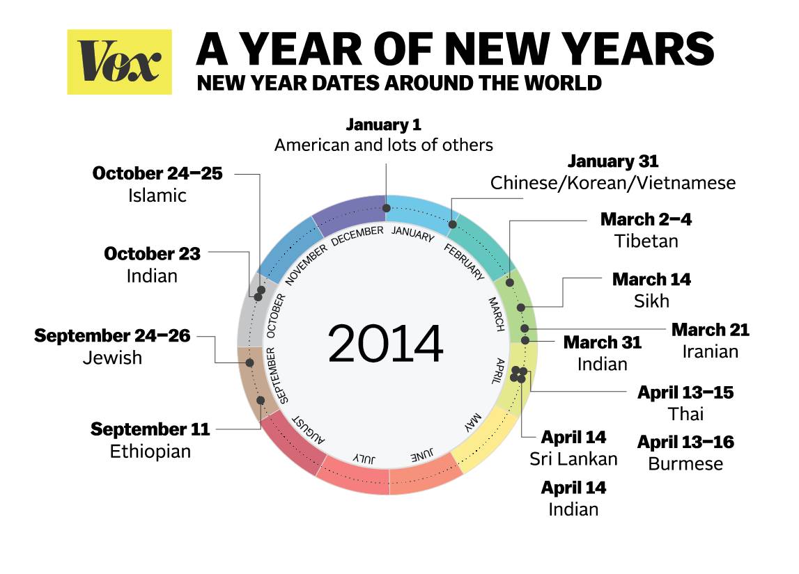 Pascal Riché et intitulé "A Year of New Years" ("Un an de Nouvel Ans") le site Vox compile - la liste n'est pas exhaustive - les différentes dates auxquelles on célèbre la nouvelle année autour du monde. Alors, on se voit le 2 mars au Tibet ?