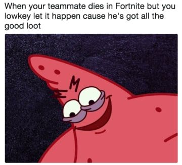 Traduction : "Quand ton coéquipier meurt dans Fortnite mais que t'as laissé sa mort se produire parce qu'il a tout le bon butin."