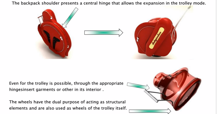 Il est si compact que lorsqu'on le replie, il se transporte dans un sac à dos (les roues correspondant à la structure du sac à dos tandis que le cadre vient s'encastrer à l'intérieur du dispositif, comme le montre la vidéo de présentation du produit). Un peu à la manière d'une tente Quechua :