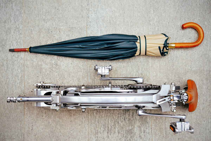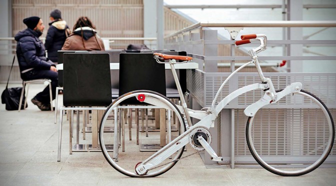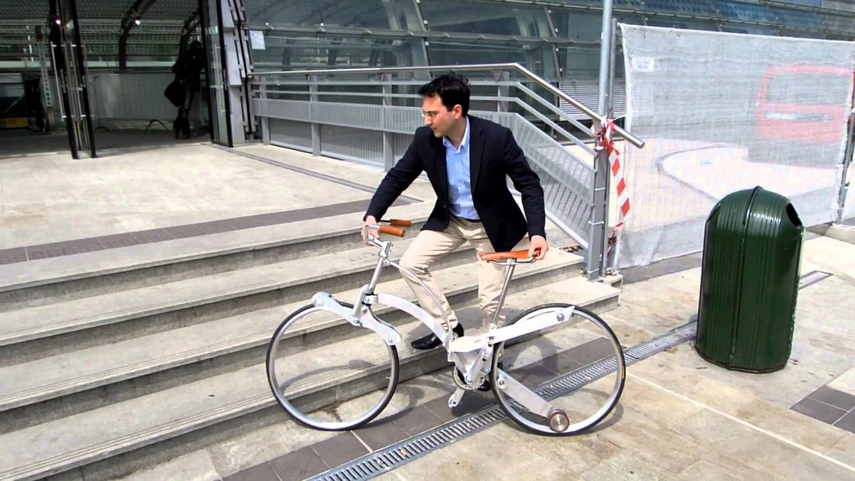 Déplié, le "Sada Bike" a tout de la bicyclette classique, avec ses 26 pouces. Sauf qu'il n'a pas de rayons... et qu'une fois bien rangé, il fait la taille d'un parapluie.