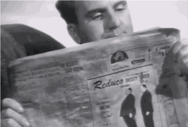 4) Lifeboat (1944) :Rôle : Une petite annonce dans le journal. Certainement la plus créative. Tout le film se déroule sur un navire, laissant peu de place à Alfred pour faire une véritable apparition. L'un des personnages lit un journal. Sur celui-ci, une publicité vante les "Reduco Obesity Slayer", des pilules liées à la perte de poids... avec les photos d'Alfred Hitchcock qui illustrent leurs effets, avant et après leur prise. En 1973, dans une interview de Tom Snyder - animateur de la télévision américaine - le réalisateur révèle qu'il avait perdu 45 kilos durant le tournage du film.