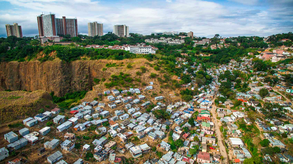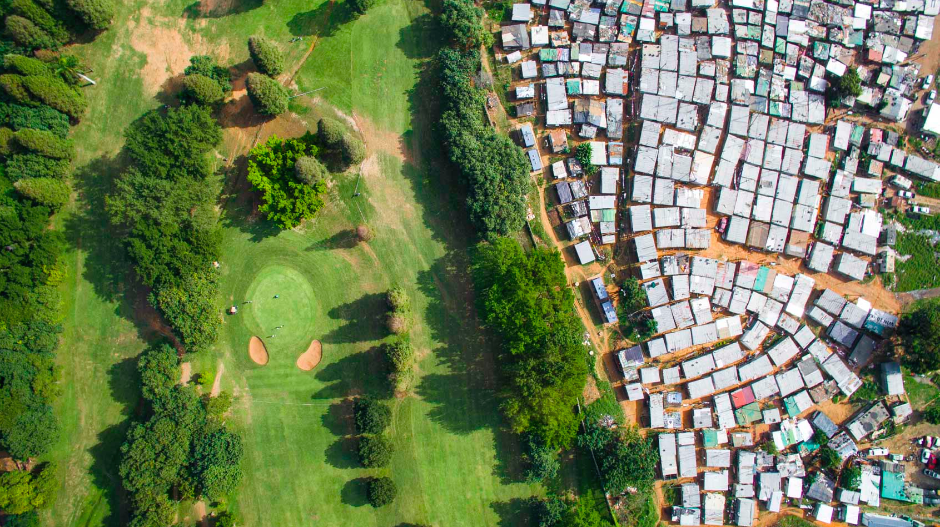 "En Afrique du Sud, les riches se situent en haut de l'échelle, non seulement financièrement mais aussi géographiquement", écrit Johnny Miller . Ici, les cabanes de Morningside, quartier huppé de la banlieue de Durban, côtoient les grandes propriétés du haut de la colline. L'une d'entre elles appartient au Président Jacob Zuma. À côté, des milliers de personnes sont exposées aux pluies torrentielles ou à la menace permanente d'un incendie.