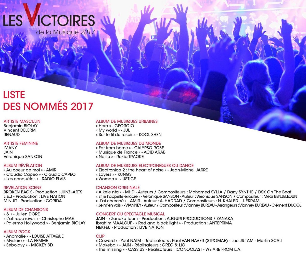 La liste des Nommés aux Victoires de la Musique 2017 vient d'être rendue publique. Pour les plus notables :