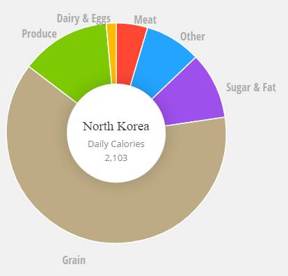 C'est en posant notre regard sur l'évolution par pays que d'autres grandes surprises sont notables. Ainsi, les Chinois mangent en moyenne quinze fois plus de viande qu'en 1961 alors que le même indicateur est en baisse de 46% pour l'Uruguay. Plus généralement, ces différences se traduisent par un écart parfois gigantesque entre plusieurs régions, notamment en termes de diversité de l'alimentation. Ainsi les Nord-coréens, dont 76% des calories sont apportées par les légumes, les fruits et les céréales, ne consomment de viande qu'à hauteur de 5% de leur régime.