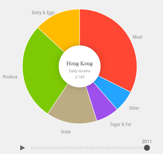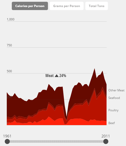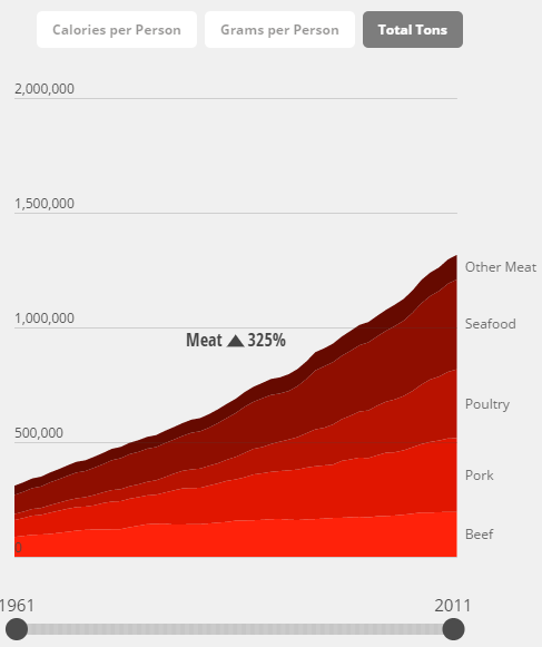 On a donc accès à des données détaillées sur ce que mangent les humains dans leur ensemble ou selon leur pays. On peut apprendre que l'homme moyen se nourrit en 2011 de 45% de céréales, et que 20% des 2870 calories ingurgitées quotidiennement lui étaient apportées par les sucres et lipides divers. Mais ces chiffres sont stables par rapport aux années 1960. C'est sur notre consommation de viande que le changement est le plus significatif : on en mange deux fois plus par jour qu'il y a cinquante ans, en termes de calories, pour une quantité quatre fois plus grande produite au total dans le monde, comme le monde ce graphique.