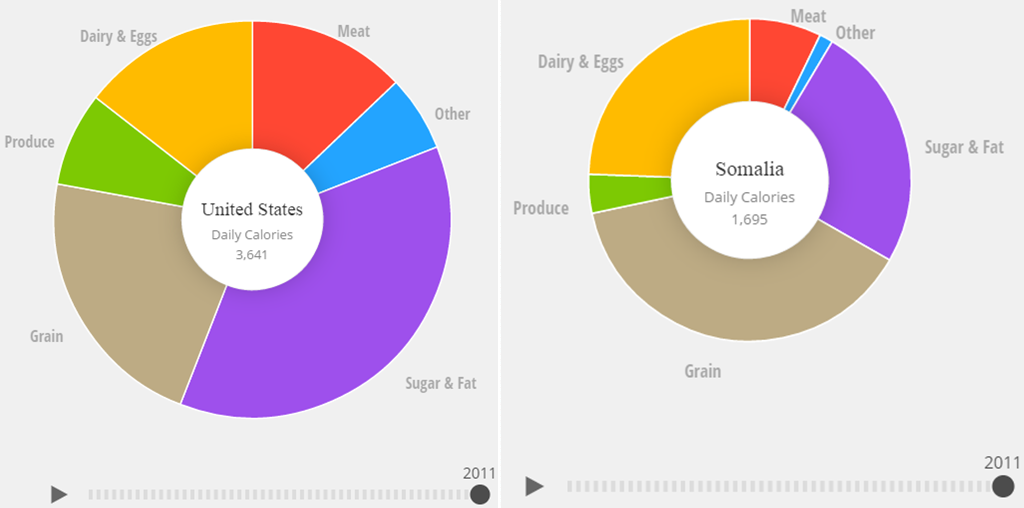 Les disparités économiques se répercutent dans les assiettes. On note ainsi que l'Américain moyen ingère deux fois plus de calories par jour que le Somalien lambda, et presque six fois plus de viande en termes de quantité.