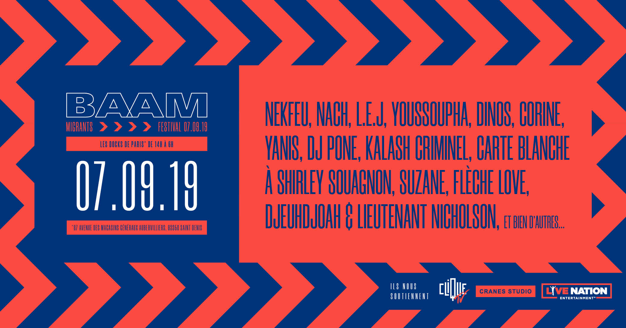 Pour soutenir financièrement cette structure et créer une rencontre entre les migrant.e.s et le grand public français, le BAAM organise le 7 septembre un grand festival multiculturel (et Clique est très fier d'en être partenaire). Au programme de cette première édition : une journée d'échanges et de solidarité sur le thème de la migration avec des concerts, du stand-up, des ateliers culturels, des débats, des expos d'artistes migrant.e.s...