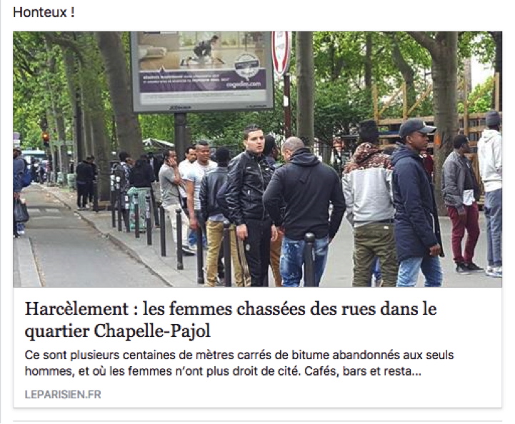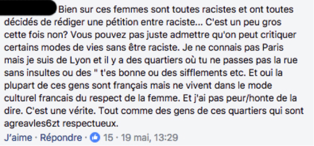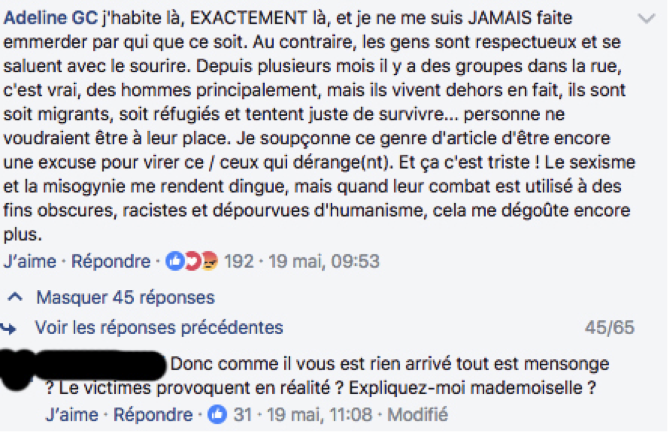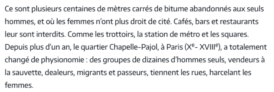 Je ne dis pas qu'il est impossible qu'une fille se fasse aborder ou embêter dans ce quartier, mais qu'un quotidien important fasse courir la rumeur que les femmes y « sont chassées » et « n'y ont plus le droit de cité », en pointant du doigt, entre autres, les migrants, cela est insupportable.