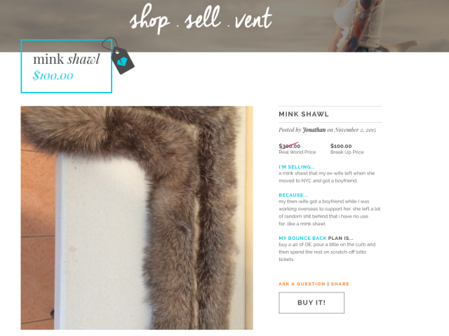 "Si vous y réfléchissez, le marché de la rencontre en ligne s’élève à deux milliards de dollars, et zéro pour celui de la rupture", explique-t-elle à Quartz.Pourquoi revendre ces objets sur une plateforme spécifique, au lieu de les mettre en vente sur eBay, PriceMinister et consorts ? Au-delà de l’aspect financier, le site possède une rubrique "sociale" où les gens peuvent raconter leurs histoires, vider leur sac et échanger avec d’autres internautes. Avec un design emprunté aux magazines féminins, Never Liked It Anyway, s’adresse avant tout aux femmes. Cela dit, un homme y a tout de même revendu un manteau en vison.