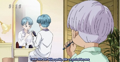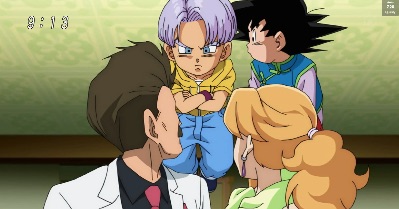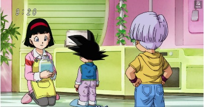 7) Satisfaits d’eux-mêmes, Goten et Trunks se rendent chez Videl et Gohan. Goten offre l’eau à Videl qui se rend compte que celle-ci est ordinaire. Afin de ne pas le blesser, elle le remercie chaleureusement.